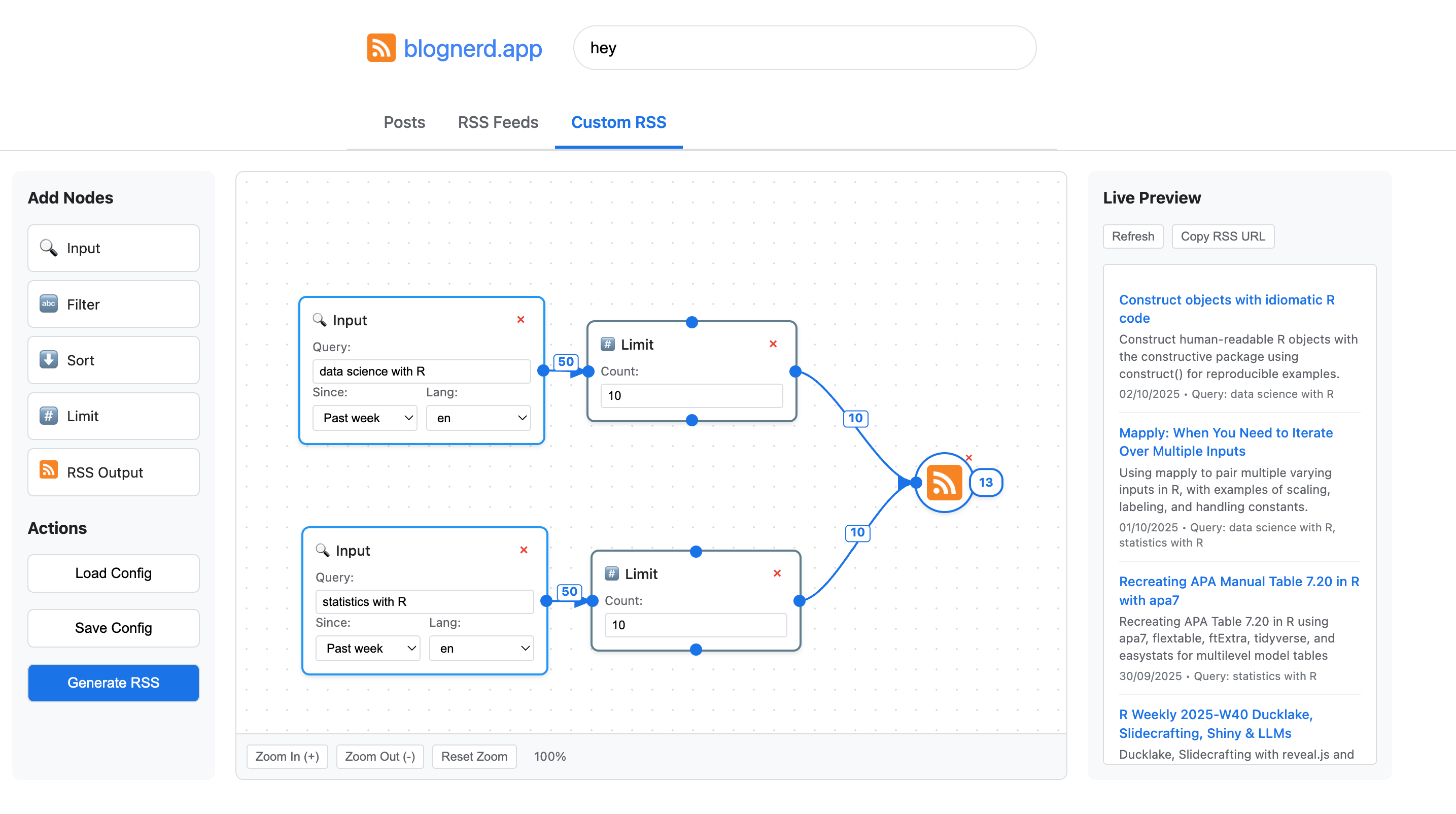 The big new thing here is the ability to customise feeds. It’s somewhat inspired by Yahoo! pipes which among other things let you mash together feeds from the web using a graphical interface. Here’s how it looks on blognerd.app